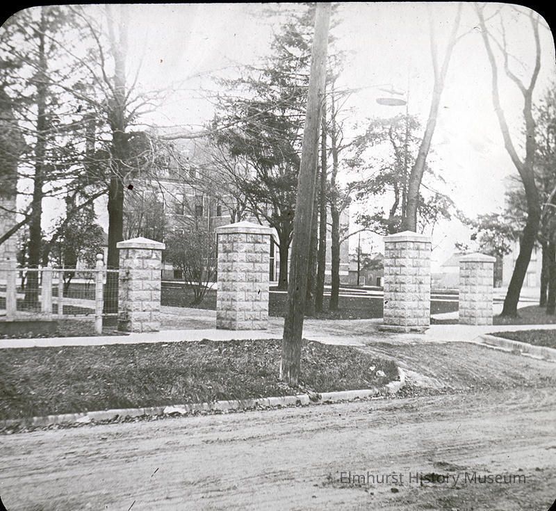 Elmhurst College entrance gate on Prospect Avenue.