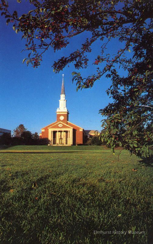 Postcard photograph of Hammerschmidt Chapel at Elmhurst College from a distance.