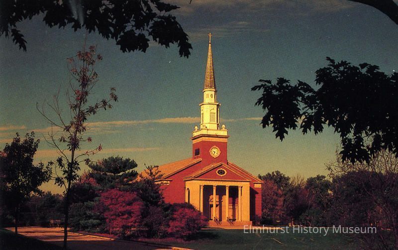 Postcard photograph of Hammerschmidt Chapel at Elmhurst College from a distance.