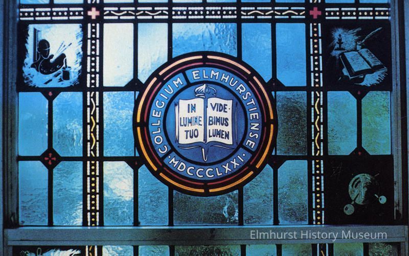 Elmhurst College seal in stained glass in Hammerschmidt Chapel