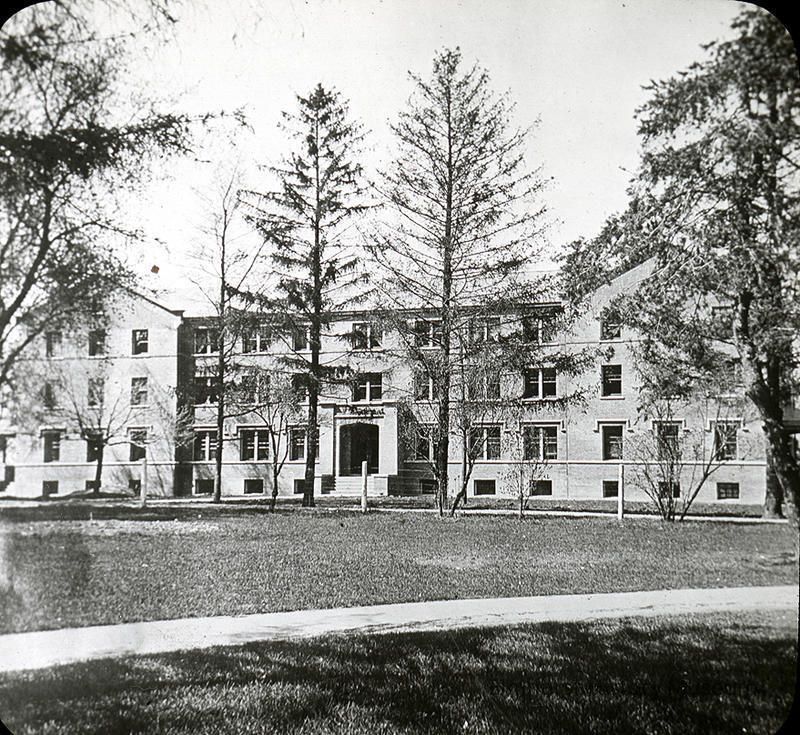 Glass Slide, black and white. New facade on Irion Hall at Elmhurst College