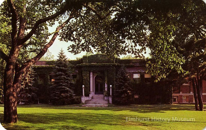 Postcard photograph of the Memorial Library at Elmhurst College.