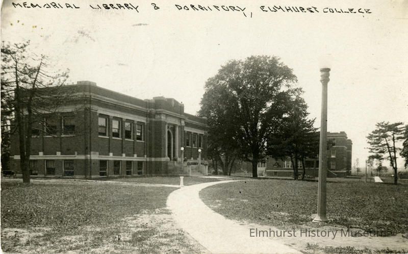 Elmhurst College library building and dormitory, the north and east facades. Memorial Library was built in 1921. Card bears a cancelled green two-cent stamp and is postmarked "Elmhurst July 25 1923(?)."Photograph Details