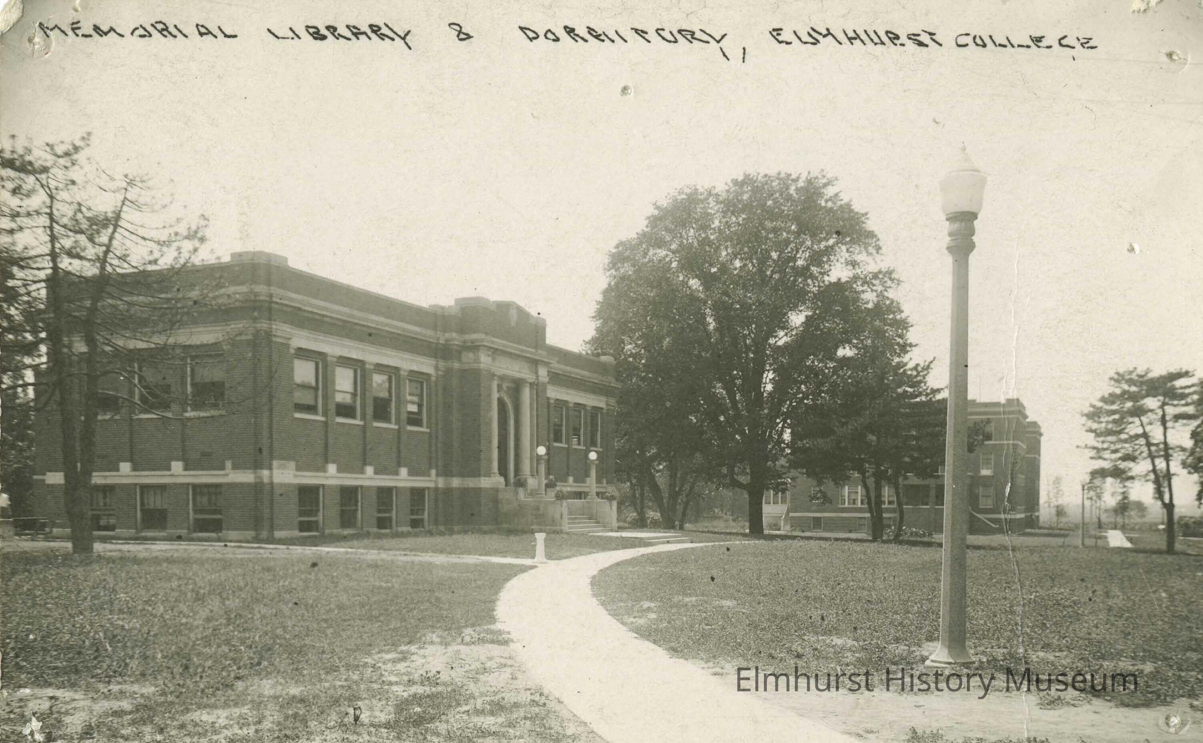 "Memorial Library & Dormitory, Elmhurst College" is written in black across top of photo. "Photo View / Made by P.L. Huckins / 1137 Barry Ave. Chicago, Ill."