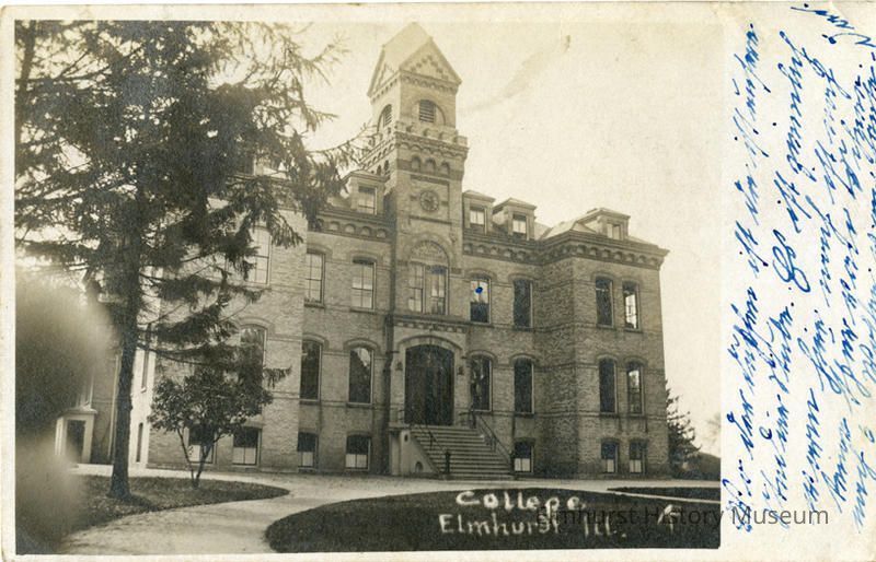Old Main building of Elmhurst College. There is a message writtenon the image side of the postcard and more on the back. It is in German and was to "Rev. J. Hetzel" in "Watervlict, Mich." Postmarked "Elmhurst, Ill Nov 9 1907 7:30 A.M."Photograph Details