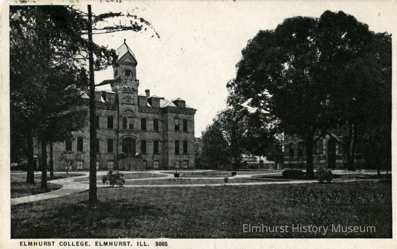 Printed in black ink on front "Elmhurst College Elmhurst ILL 5005." Written in red on the back "Built in 1878."