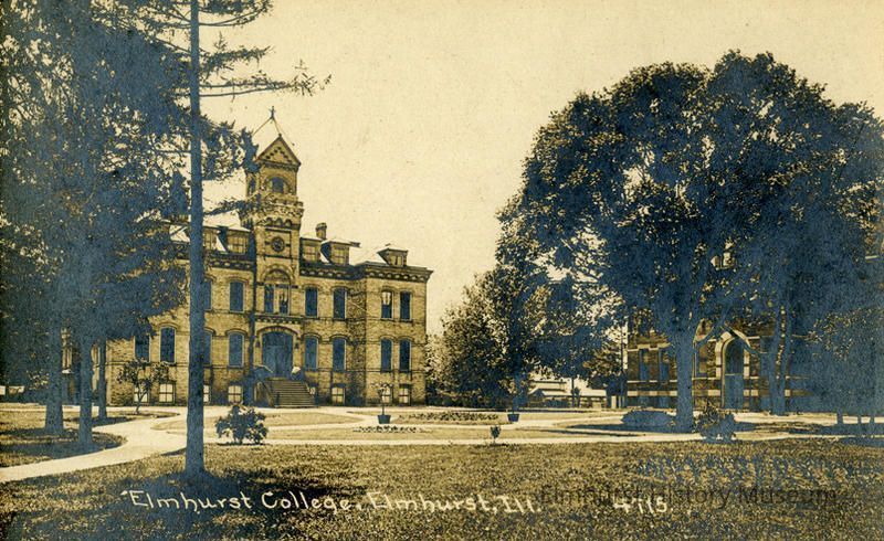 Photographic postcard of Elmhurst College campus focusing on Old Main.
