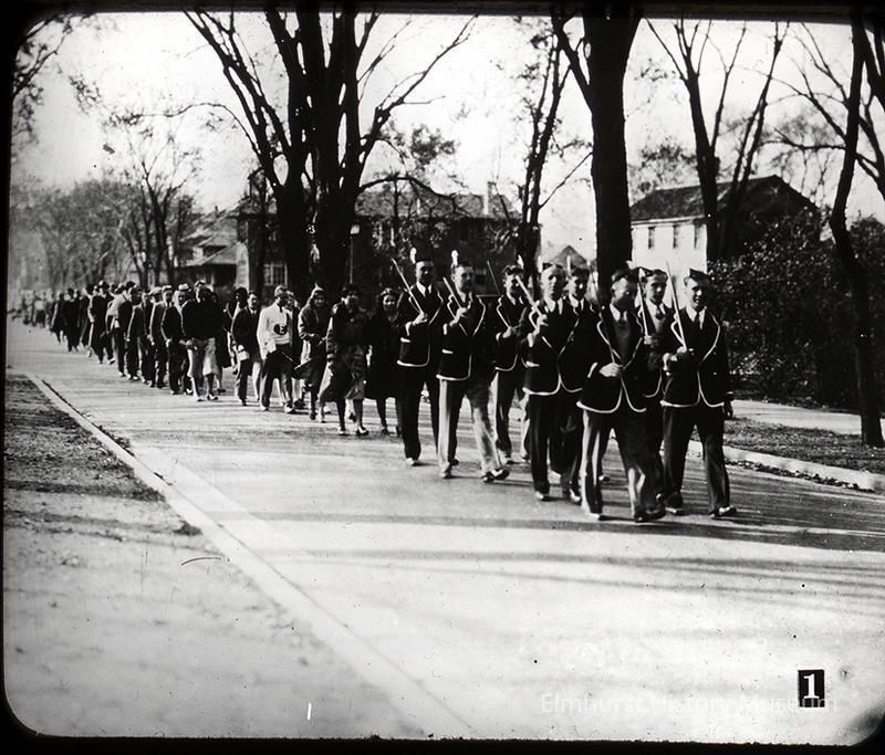 Elmhurst College Parade "marching towards athletic field" (caption on slide).Photograph Details