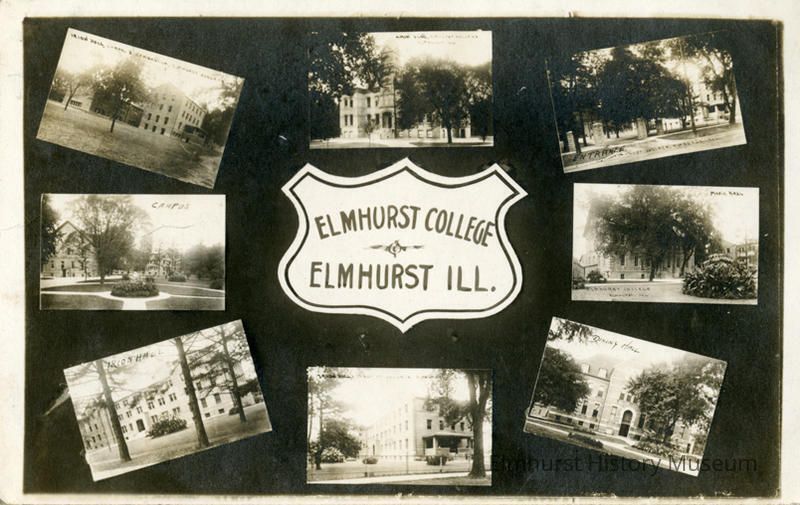 8 black and white photos of Elmhurst College including Irion Hall, Dining Hall, Music Hall and the Main Building surrounding a white shield shape in the center printed with "ELMHURST COLLEGE / ELMHURST ILL." Photos are set on a dark brown or black background. Maker's information "Real Photo Made by P.L. Huckins at 302 East 35th St. Chicago ILL" is printed on the reverse. Spaces have been delineated for correspondence, name and address. There is a white border on all image-side edges. Postcard has not been used.Photograph Details