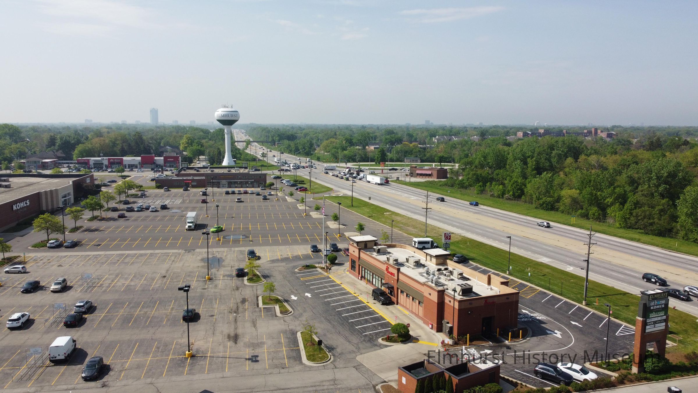 Aerial view of Elmhurst Crossing Shopping Center, looking north towards St. Charles Road. Chick-fil-A restaurant is in the foreground.Photograph Details