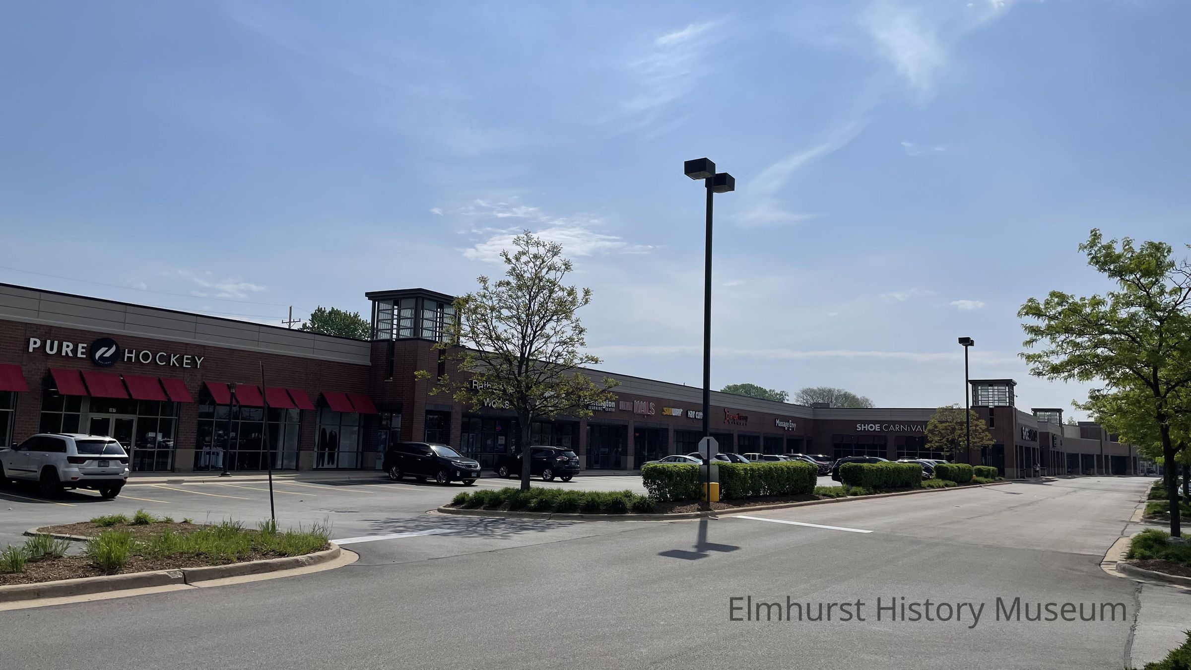 Elmhurst Crossing Shopping Center storefronts, looking south from the north entrance of the shopping plaza.Photograph Details