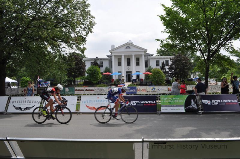 Cyclists race in 5th Annual Elmhurst Cycling Classic. Wilder Mansion is in the background.Photograph Details
