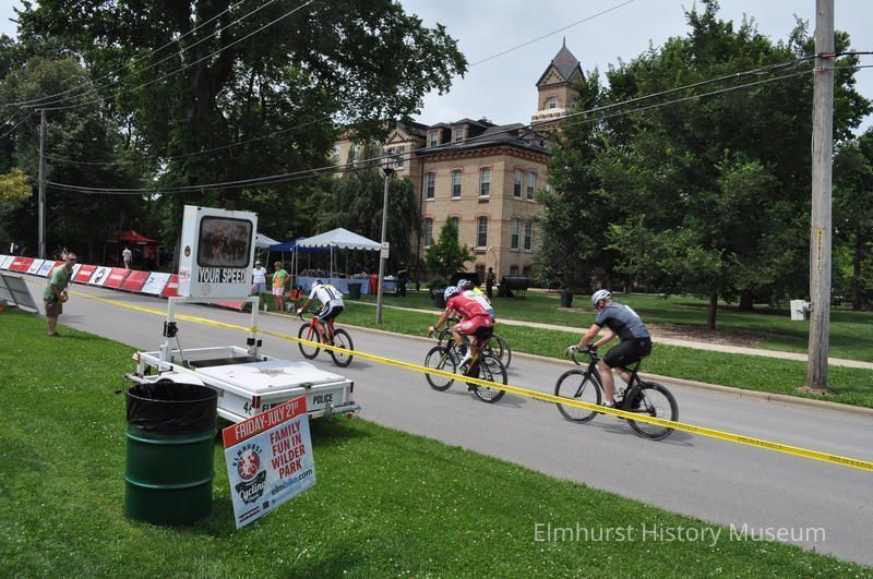 Cyclists race in 5th Annual Elmhurst Cycling Classic. Old Main on the Elmhurst College campus is in the background.Photograph Details