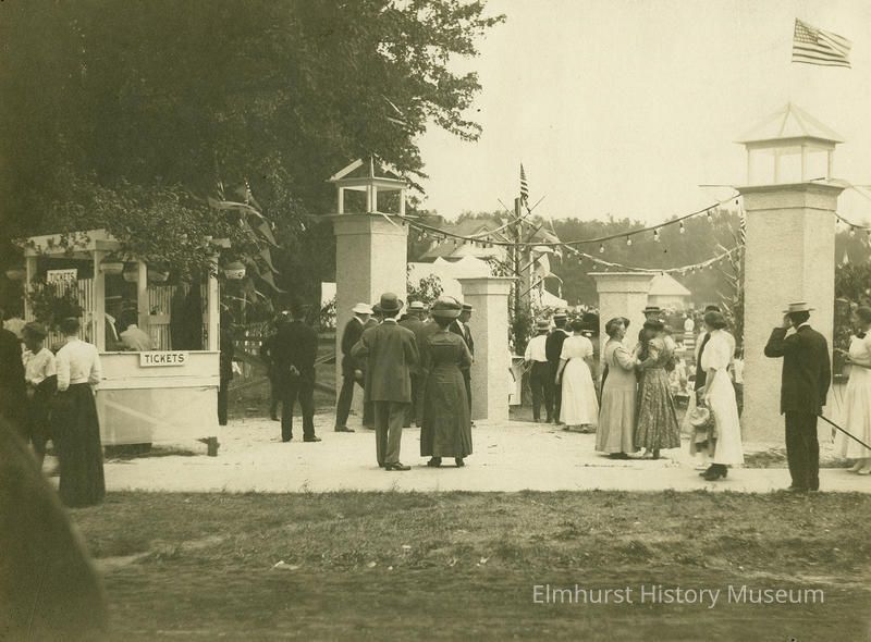 Written on the back top in cursive in blue ink is "1911 - Fall Festival run by businessmen where Post Office Stands (1940) 1911 (encircled)." Back is stamped "Elmhurst Historical Commission" and negative numbers are noted as well.