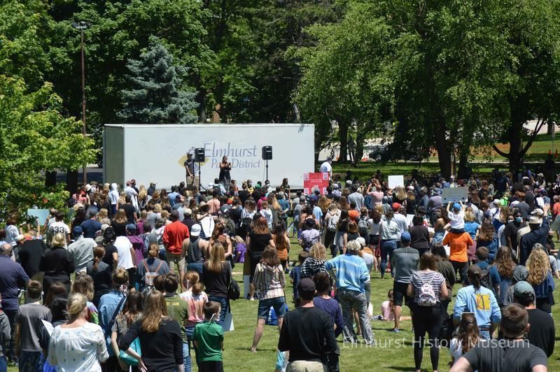 A speaker addresses the Elmhurst Family Walk for Racial Justice in Wilder Park, a rally and protest march related to the killing of George Floyd in Minneapolis and the reaction against police brutality.Photograph Details