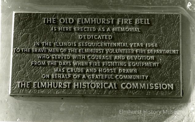 Plaque reads: The Old Elmhurst Fire Bell is here erected as a memorial dedicated in the Illinois Sesquicentennial year 1968 to the brave men of the Elmhurst Volunteer Fire Department who served with courage and devotion from the days when fire fighting equipment was crude and horse drawn on behalf of a grateful community. The Elmhurst Historical Commission.