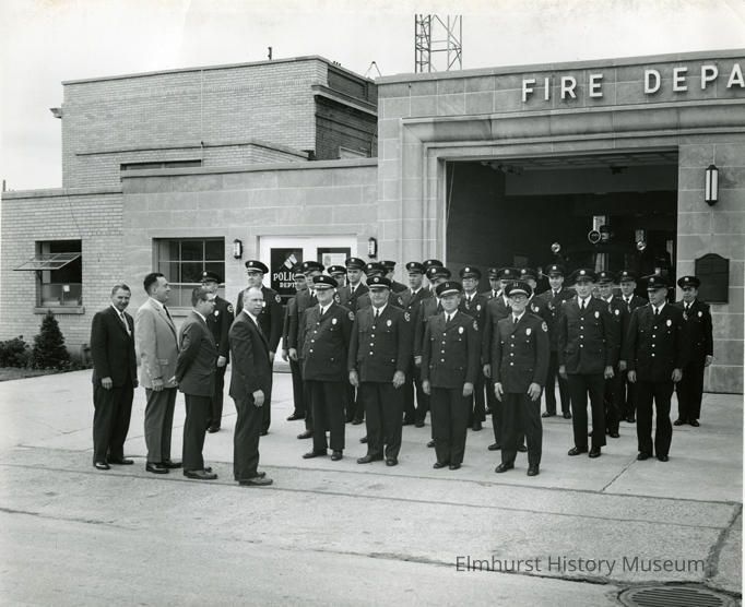 Elmhurst Fire Department fire fighters in dress uniform in front of station at 116 Schiller. Mayor Charles Weigel is on the right of the four men standing in front.Photograph Details