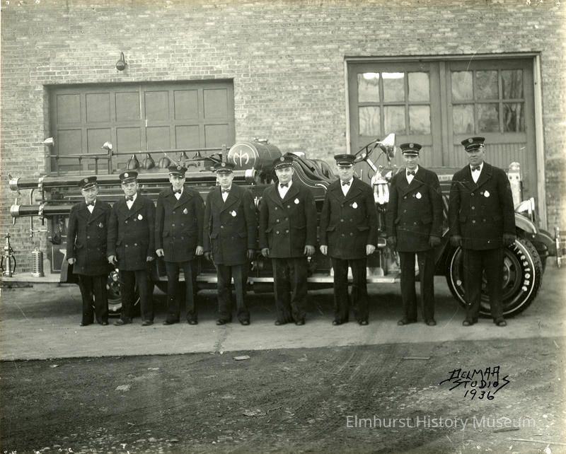 Elmhurst Fire Department fire fighters posing in front of a fire truck at the south side station on Vallette Street.