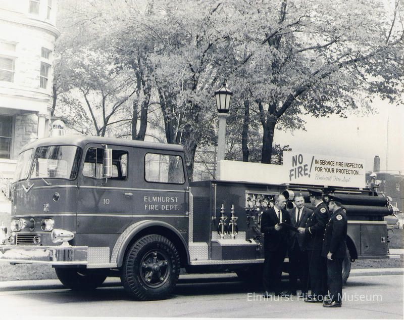 Elmhurst Fire Department inspection at City Hall in the Glos Mansion. The truck is parked on Kenilworth Avenue, and Fire Department officers are speaking with Mayor Charles Weigel, far left, and City Manager Robert Palmer.Photograph Details