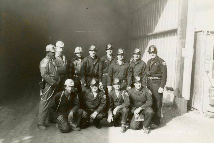 on back: Mine Rescue Team 1986 top row l to r: ECS guy, ECS guy, ECS guy, Mike Kopp, Bob Uajdick, Scott Wallace, Don Novak, Dan Fochy bottom row l to r: ECS guy, Frank Picha, Steve Boyd, Jeff Bacidore