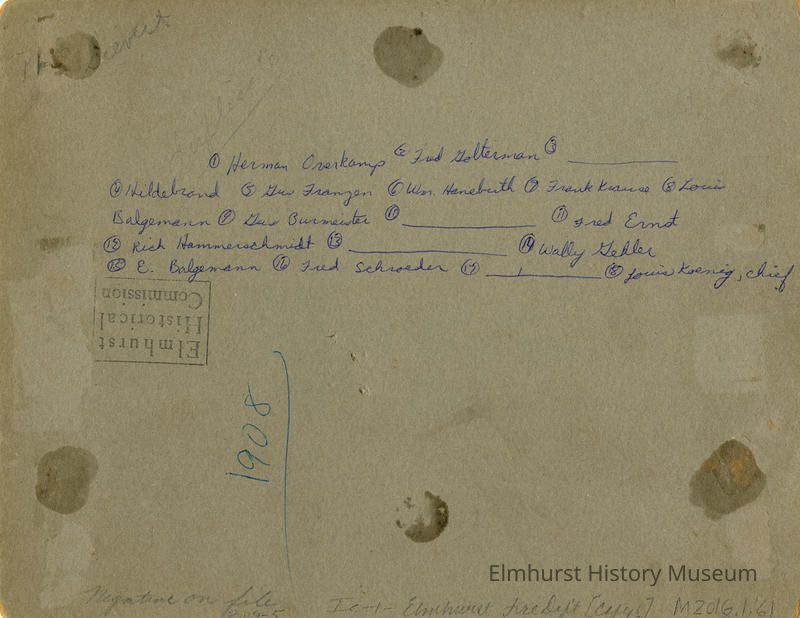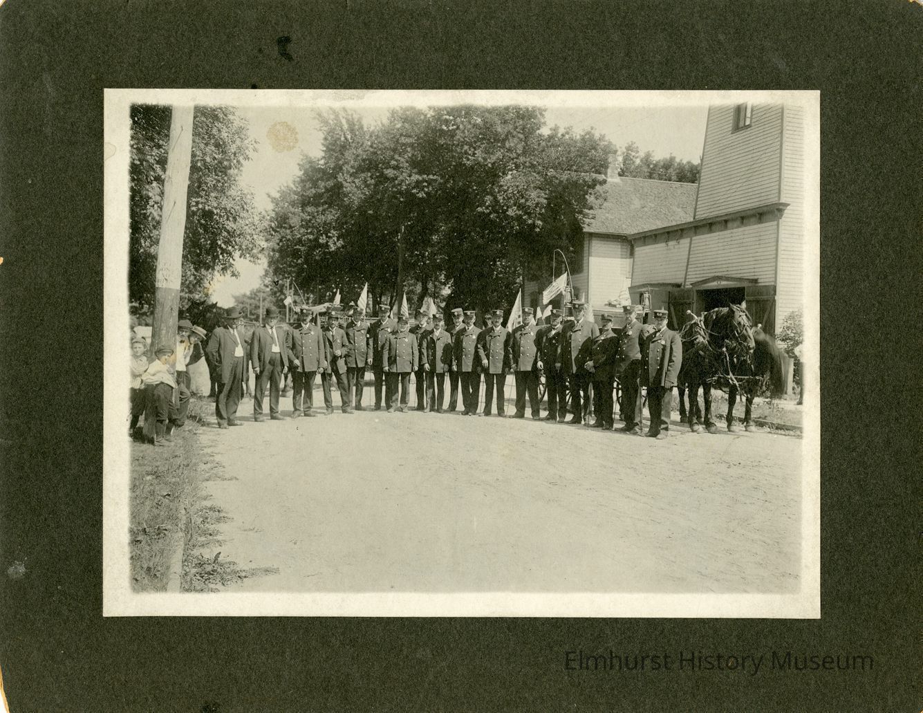 Elmhurst Fire Department fire fighters posing in front of the old curfew tower on Schiller.Photograph Details
