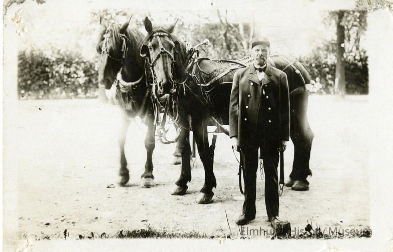 Elmhurst Fire Department volunteer Dick Rotermund posing with wagon horses.Photograph Details