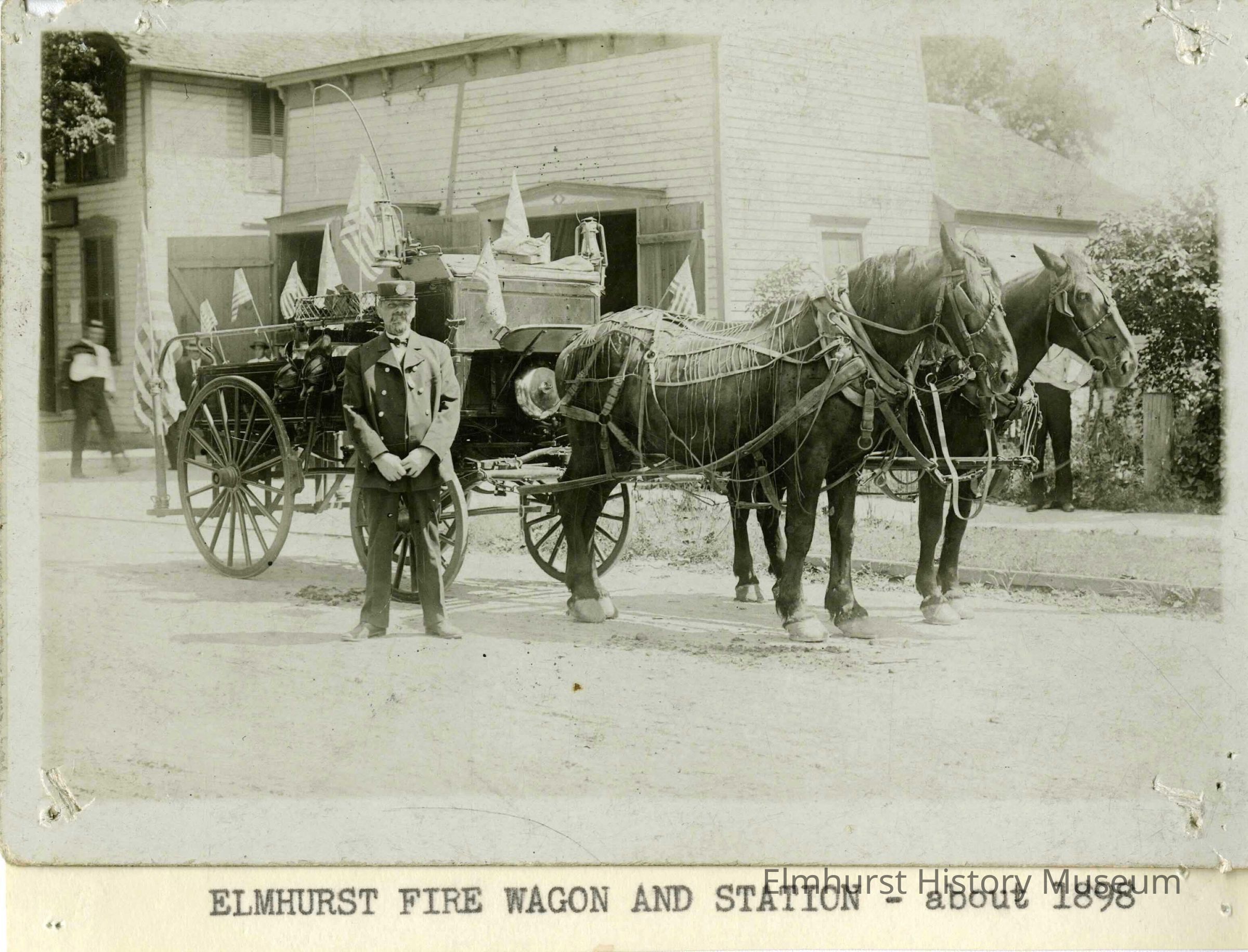 A fireman and fire wagon. The frame building is the Elmhurst Fire Station on the south side of Schiller Street.Photograph Details