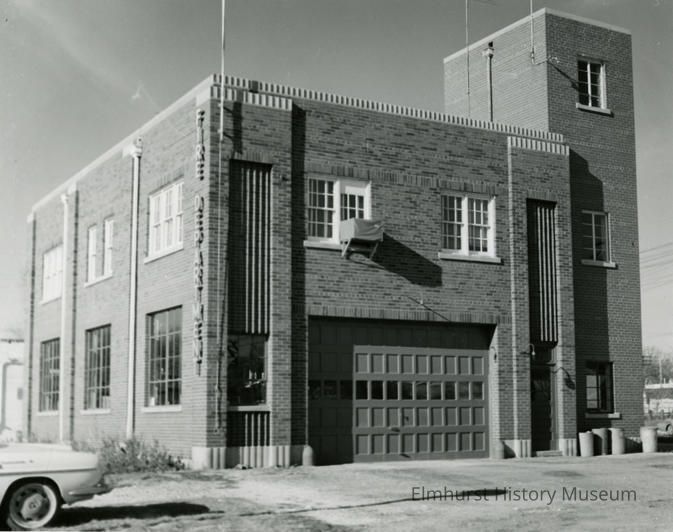 on back: City of Elmhurst - So. Side Fire Dept. Hdgtrs. (Vallette St. east of York St.) / Take Dec. 16, 1967 by R.L. Mahon with Rollei camera (75mm. lens with K2 filter Panatonic X 120 film, frame 9 Stamped on back: Elmhurst Public Library / Elmhurst, IL 60126