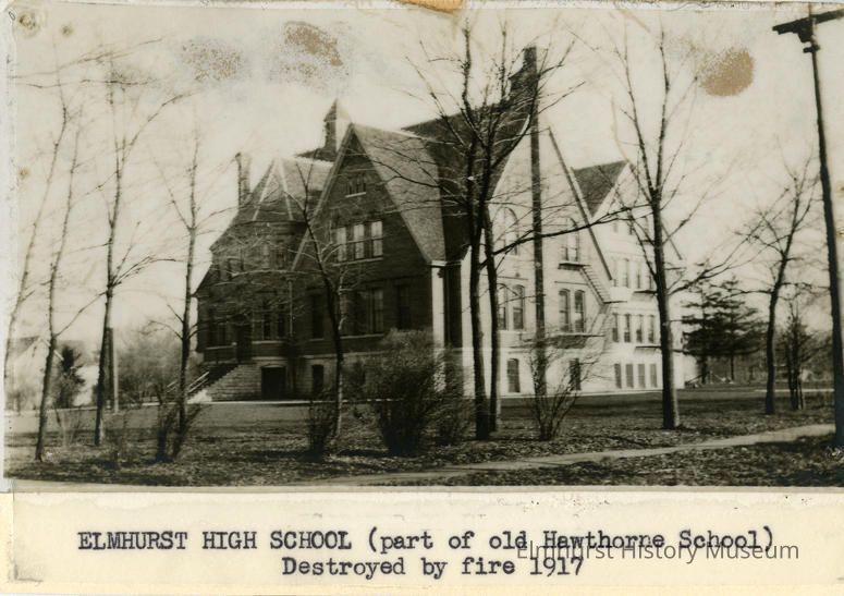 on front: Elmhurst High School (part of old Hawthorne School) Destroyed by fire 1917