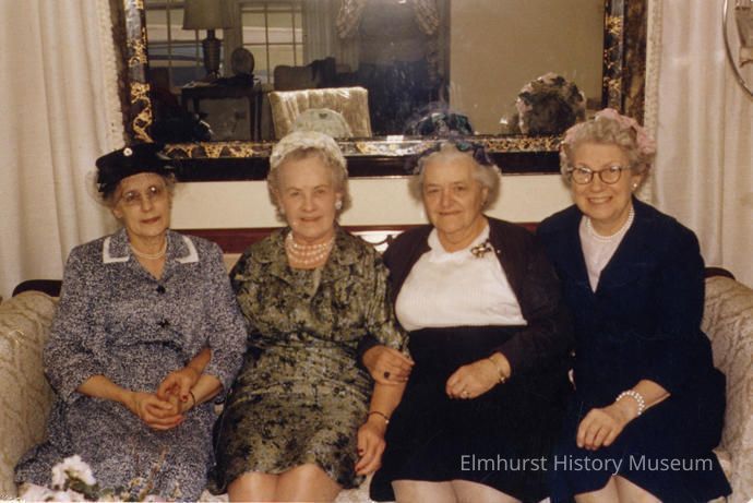 on back: 50th Reunion Class of 1912 Elmhurst High School 1912-1962 Clara Enders Leonard, Ruth Swanson Throneycroft, Gretchen Mueller Loesch, Mary Egan 3 members of class deceased: Paula Maloit, Hazel Curran, Lucille Smith Work