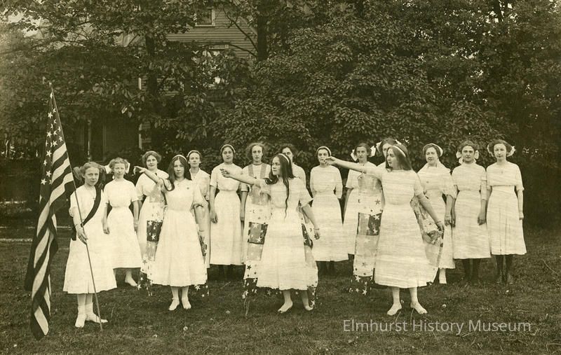 On separate paper on the front and same information on back: 1912 Pageant at Elmhurst H.S. (Hawthorne School) / Gift of Mrs. Paul Albert / Front row Left to Right: (holding flag) Laura Dunham, Mildred Pentecost, Gladys Geissler, Mabelle Glos / Back row, left to right; Bessie Hilliard, Gertrude Monk, Ruth Swanson, Hazel Curran, Marian Pearn, Clara Enders, Gretchen Mueller, Martha Popp, Faith Putnam, Winifred Clasby, Edith Torode, Hazel Langkafel