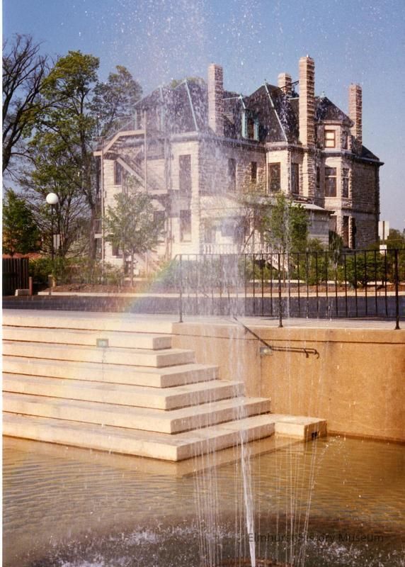 Elmhurst Historical Museum in the Glos Mansion at 120 E. Park Avenue, from the parking lot of Illinois Regional Bank through the water of a fountainPhotograph Details