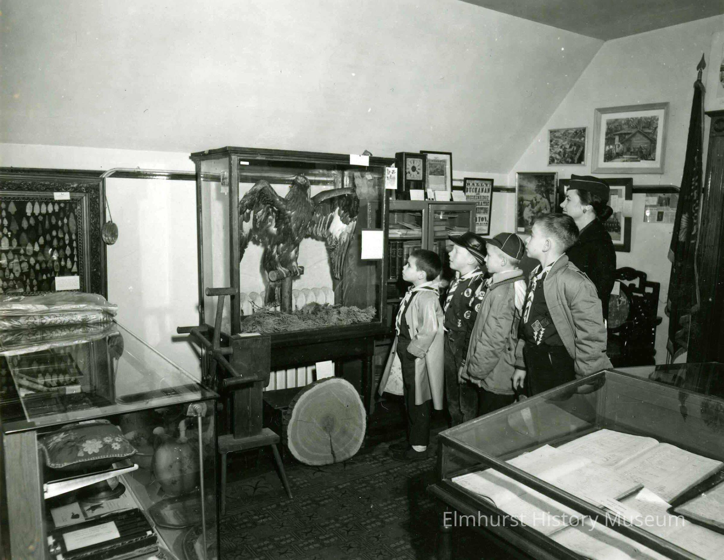 Cub Scouts viewing an exhibit at the Elmhurst Historical Museum when it was located on the third floor of Elmhurst City Hall, in the Glos Mansion, 104 S. Kenilworth Avenue.Photograph Details