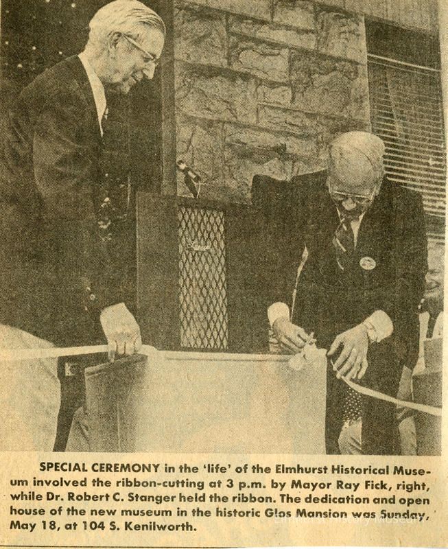 Newspapter photograph of Mayor Ray Fick and Dr. Robert C. Stanger cut the ribbon at the ceremony dedication the new Elmhurst Historical Museum at the Glos Mansion on May 18, 1975.Made/Created