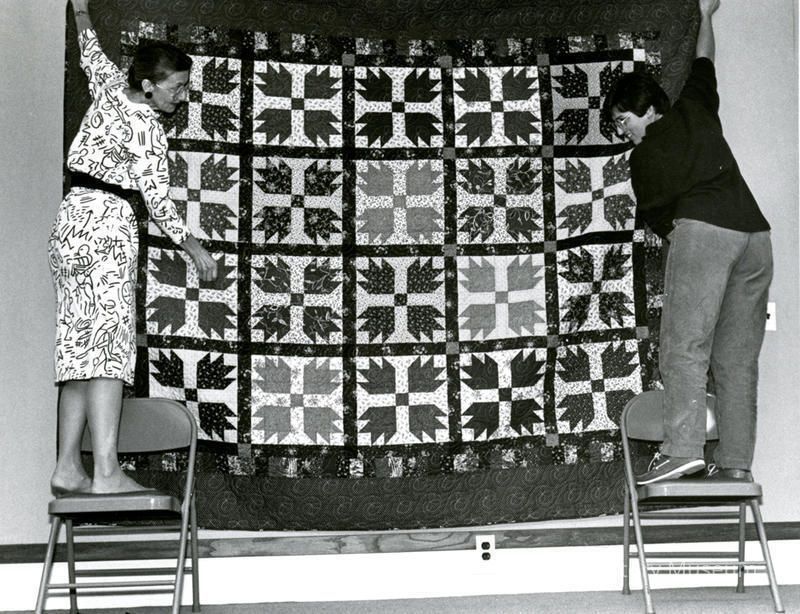 Members of the Elmhurst Piecemakers hanging a quilt at Elmhurst Historical MuseumPhotograph Details