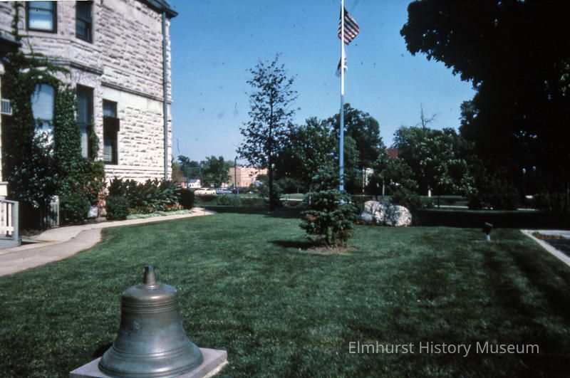 South lawn of Elmhurst Historical Museum, including the old fire bell and Salt Creek rockPhotograph Details
