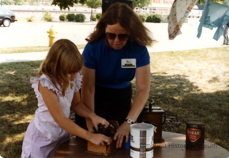 Volunteer Margaret Pruter at the coffee grinding station at Pioneer DayPhotograph Details