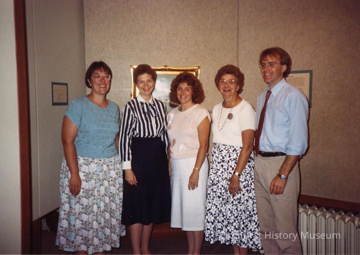 Elmhurst Historical Museum staff Nancy Wilson, Catherine Bruck, Sandy Bianchi, Grace Carolyn Dahlberg, and Brian Bergheger in the Glos MansionPhotograph Details