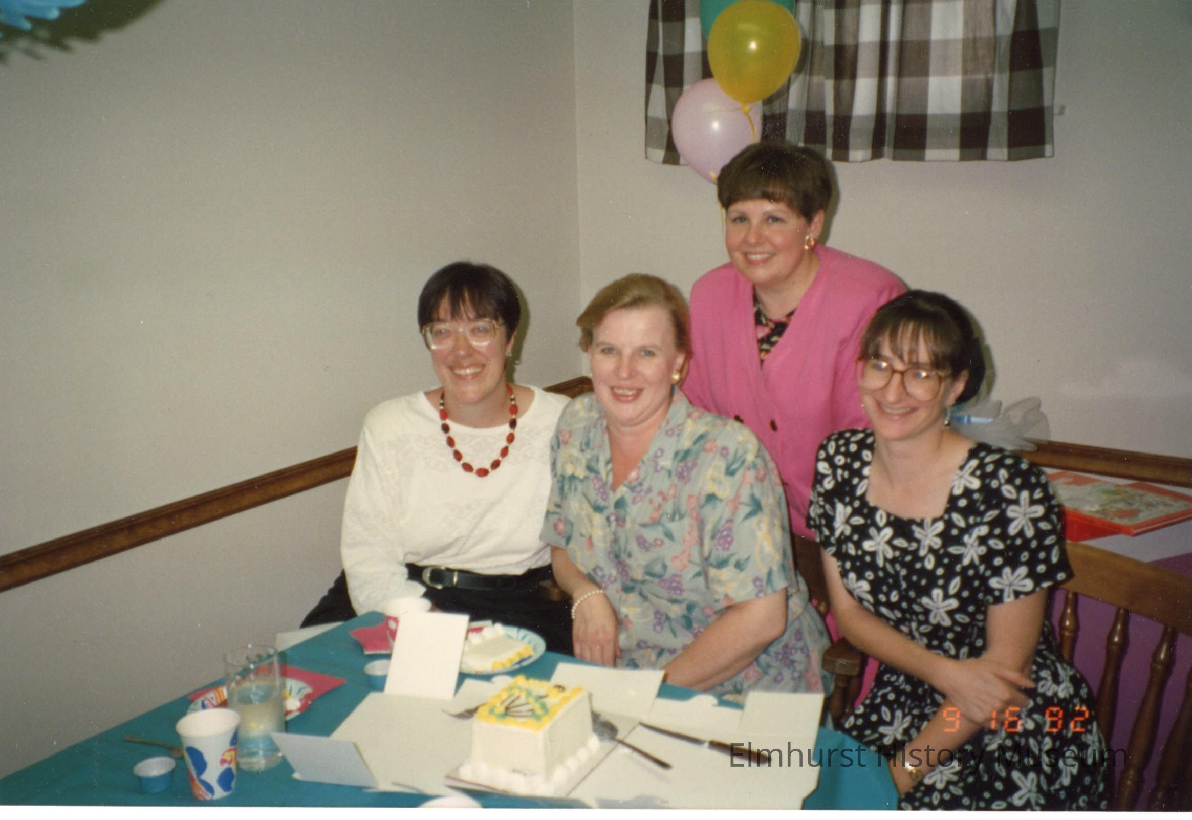 Elmhurst Historical Museum staff members (left to right) Nancy Wilson, Karen Marz, Eliose Prodraza, and Diane Gutenkauf having a party in the Glos Mansion kitchen.Photograph Details