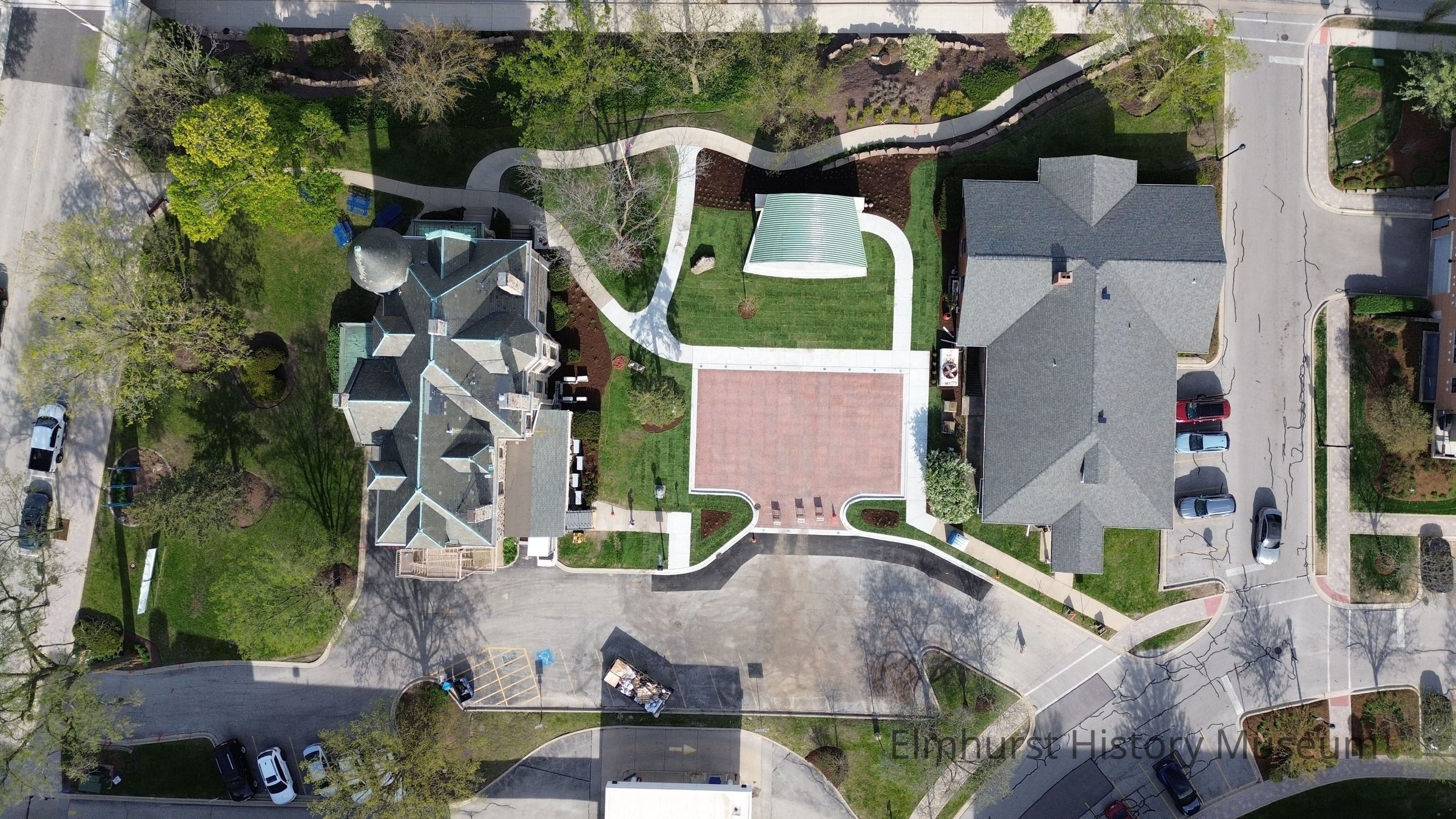 Aerial view of the EHM campus, taken shortly after the completion of the performance space area between the Glos Mansion and the Education Center.Photograph Details