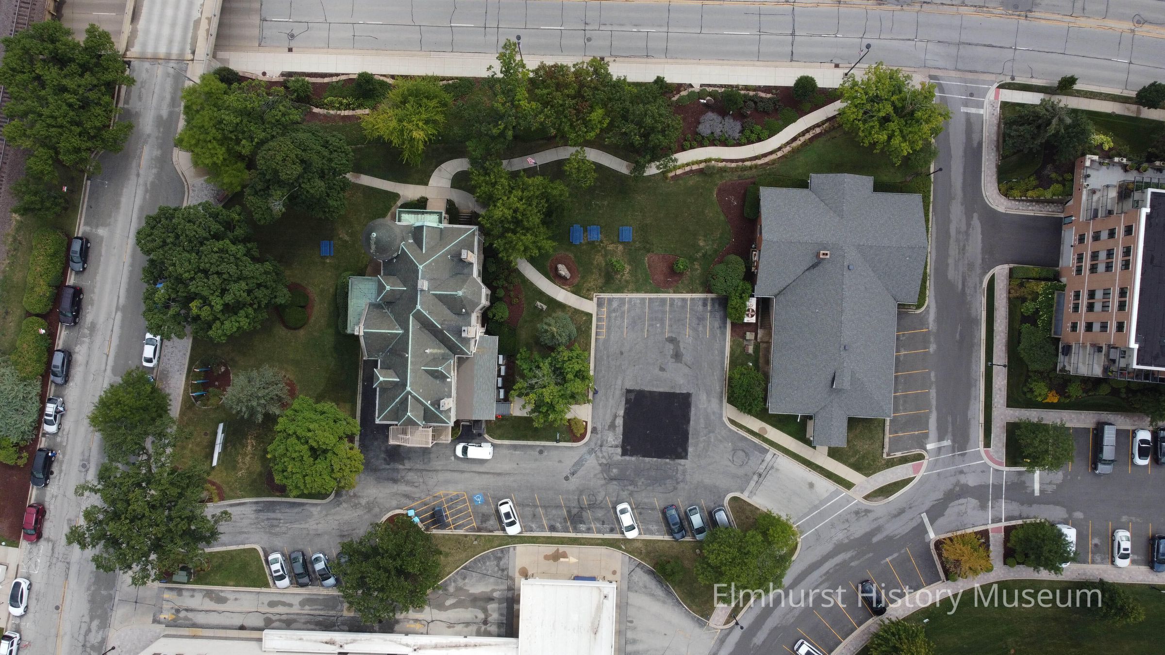 Aerial view of the Elmhurst History Museum Grounds to the west of Robert Palmer Drive.Photograph Details