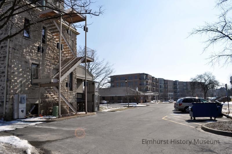 Elmhurst History Museum driveway and parking lot off E. Park Ave, showing rear view of Glos Mansion and the Education Center.Photograph Details