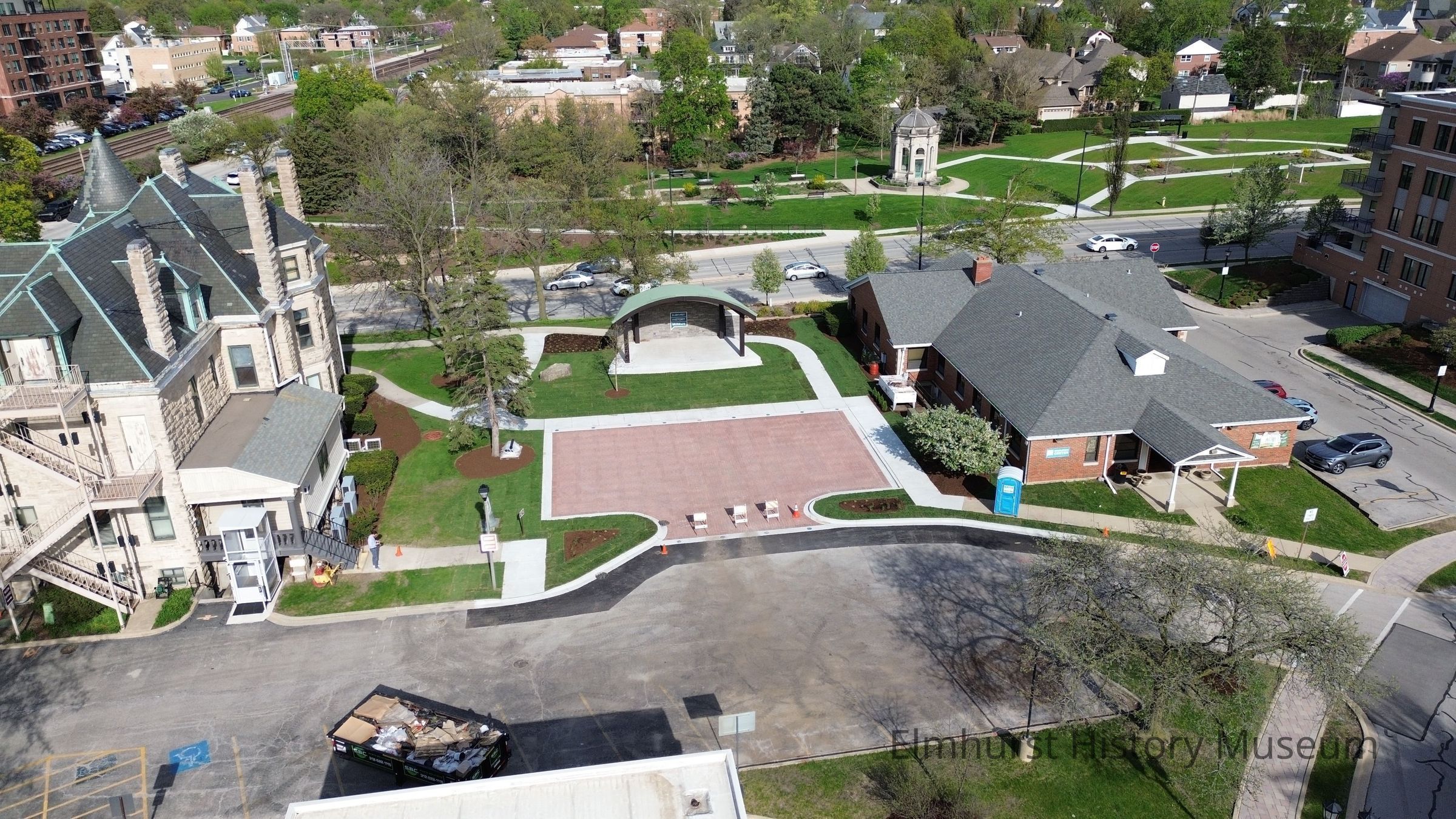 Drone photograph of the newly-completed EHM performance space area between the Glos Mansion and the Education Center.Photograph Details