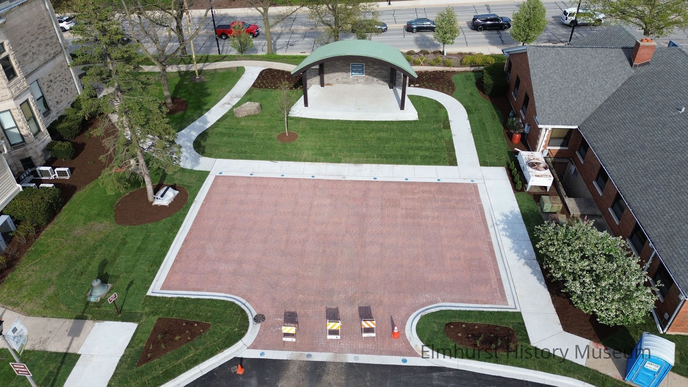Drone photograph of the newly-completed EHM performance space area between the Glos Mansion and the Education Center.Photograph Details