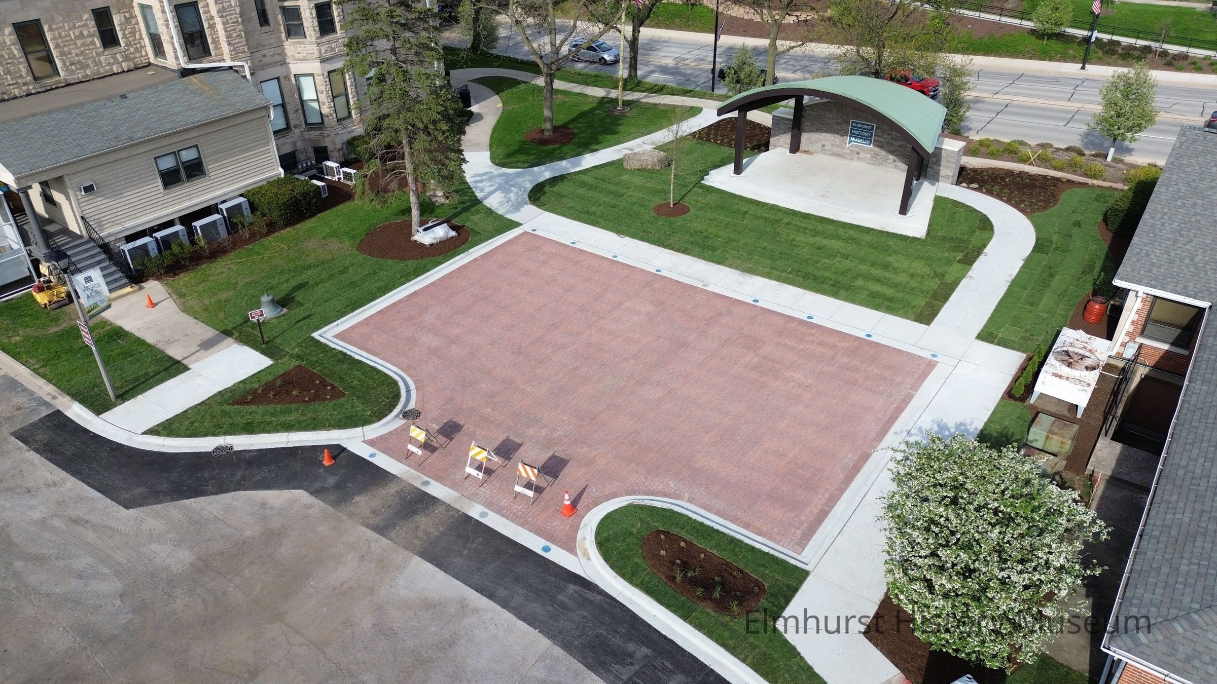 Drone photograph of the newly-completed EHM performance space area between the Glos Mansion and the Education Center.Photograph Details