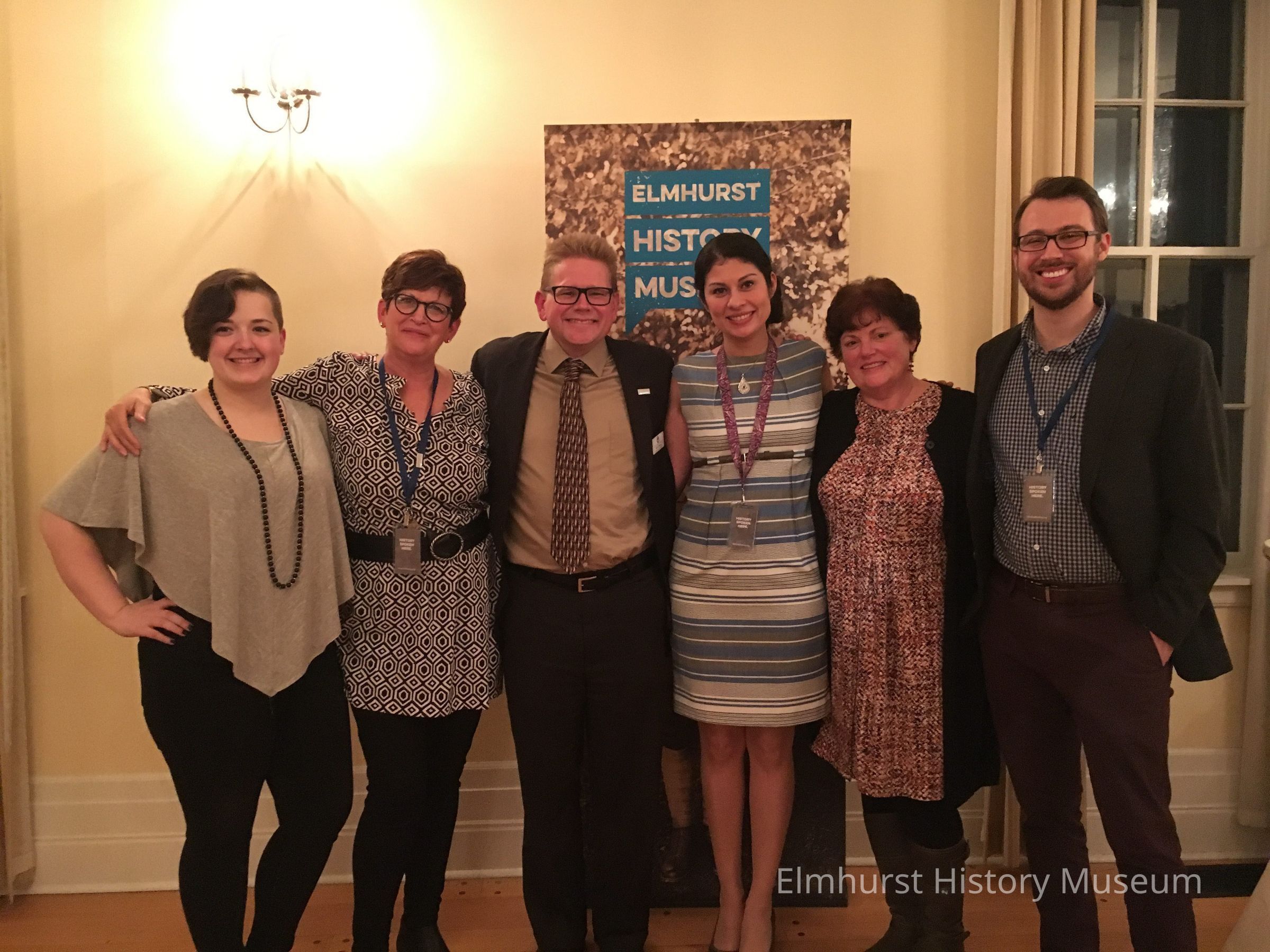 Elmhurst History Museum Staff poses for a group photograph at the Elmhurst Heritage Foundation's 10th anniversary reception at the Wilder Mansion. Names left to right: Katelyn Thurnall, Patrice Roche, Dave Oberg, Jess Wandersee, Nancy Himmes, Dan Lund.Photograph Details