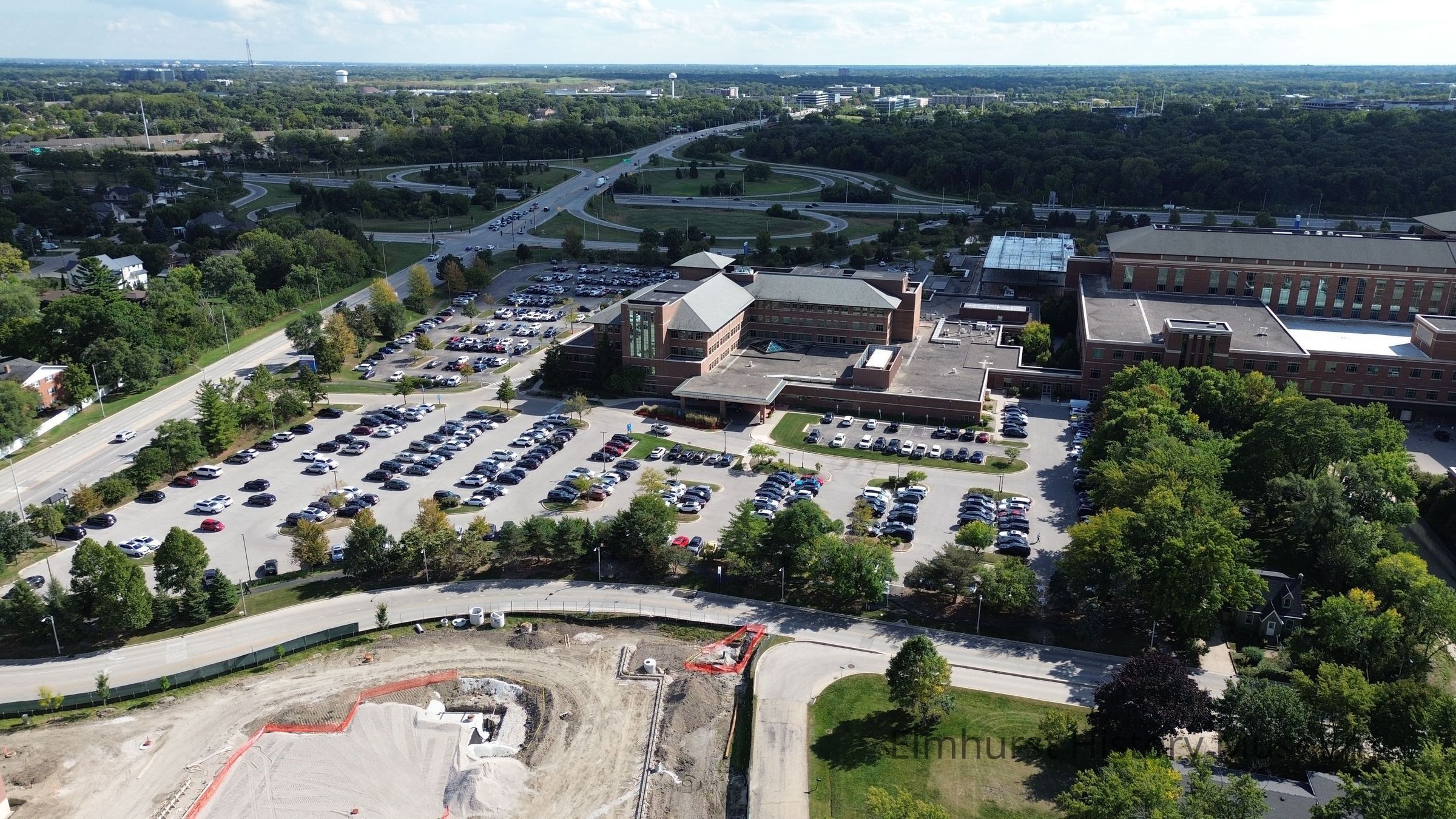 Aerial View of Elmhurst Memorial Hospital, looking south from Lexington Street. New construction along Harvard Street in the foreground.Photograph Details