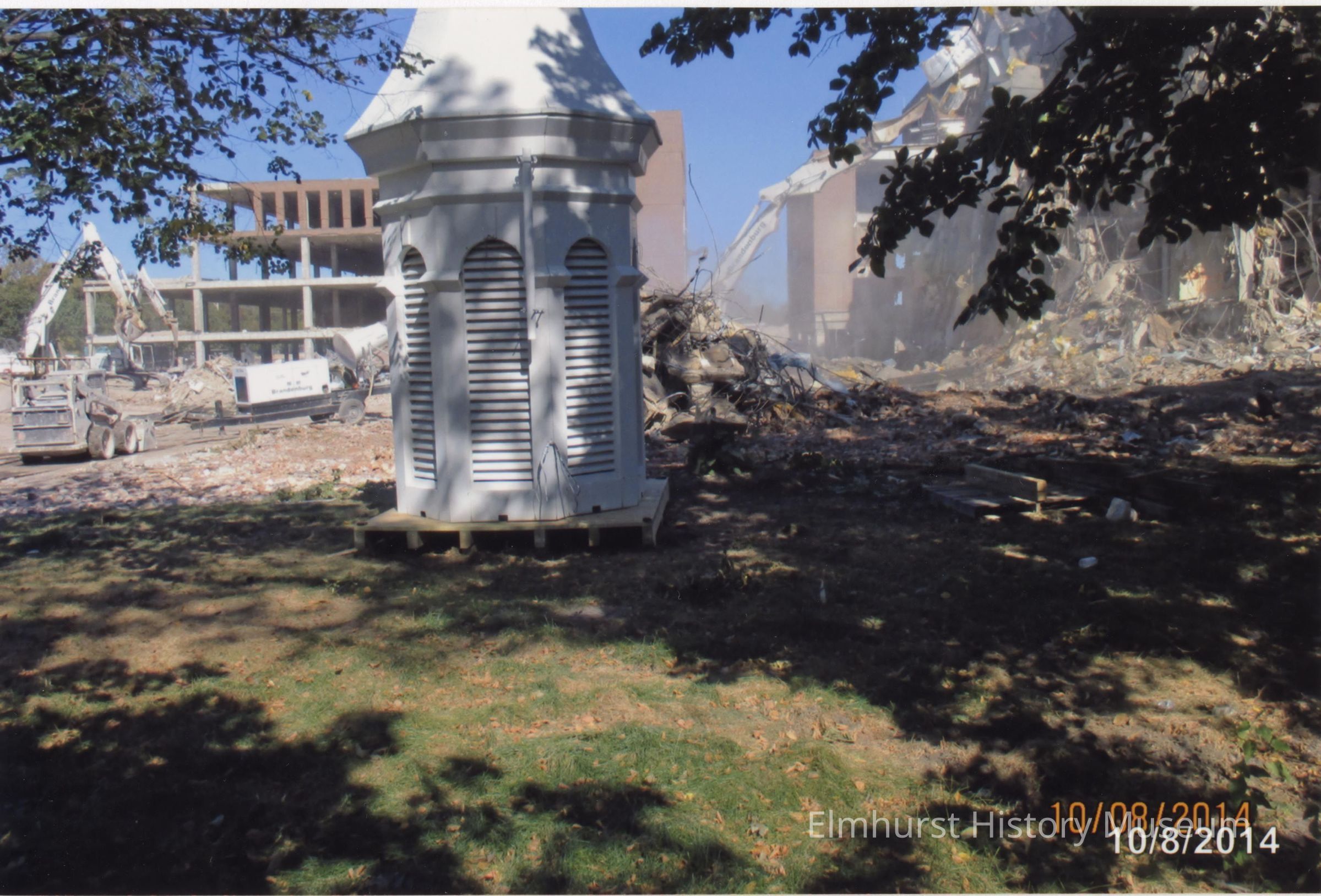 Demolition of the original Elmhurst Memorial Hospital at Schiller Street and Berteau Avenue. The white cupola on the main building was salvaged.Photograph Details