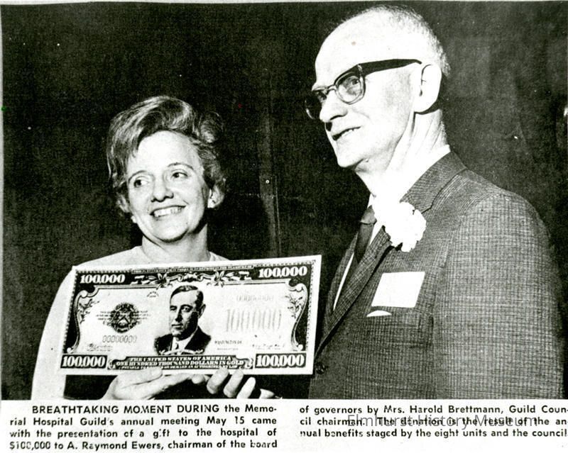 Newspaper photograph features Mrs. Harold Brettmann presenting a gift of $100,000 from the Memorial Hospital Guild to A. Raymond Ewers, Board of GovernorsPhotograph Details