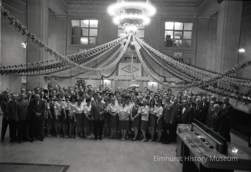 Group photo of staff at the Elmhurst National Bank 75th anniversary party.Photograph Details